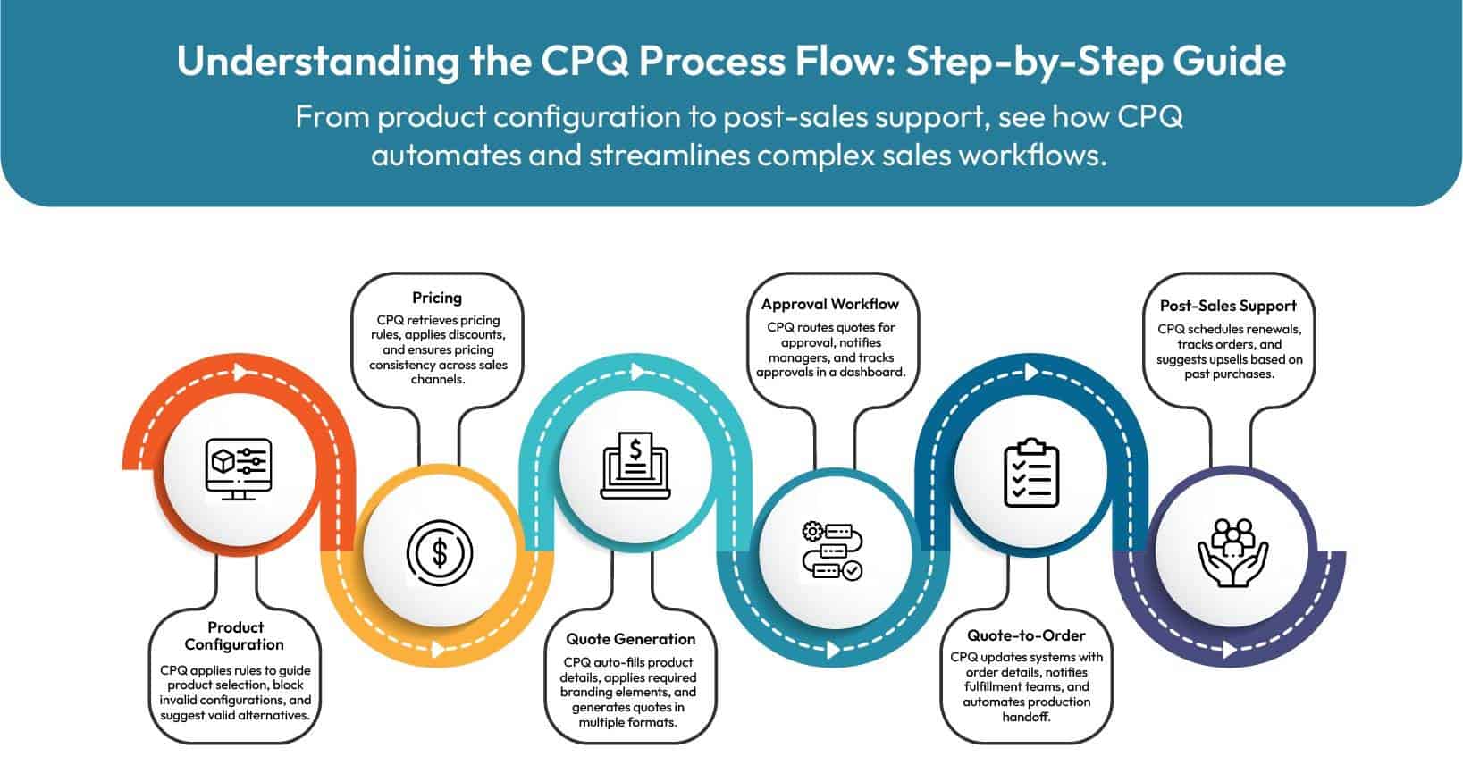 The CPQ process flow shortens sales cycles, improves quote accuracy, and increases win rates. It enables reps to generate personalized quotes quickly, enhancing customer experience and driving higher revenue.
