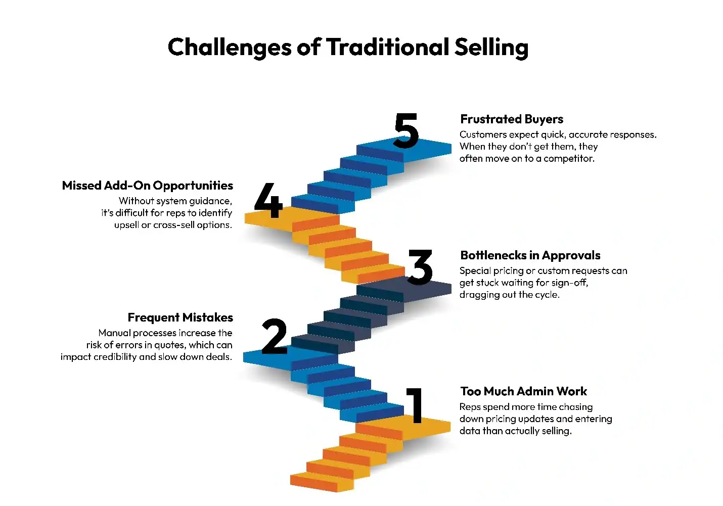 This shift has made selling more complex, creating a frustrating reality for many sales teams: sales cycles are getting longer and deals are harder to close. Without the right tools, reps often find themselves buried in manual work—digging through product catalogs, keeping track of ever-changing pricing updates, and building quotes by hand. These inefficiencies lead to errors, delays, and ultimately a breakdown in buyer trust. The result is wasted time, missed opportunities, and deals slipping away.