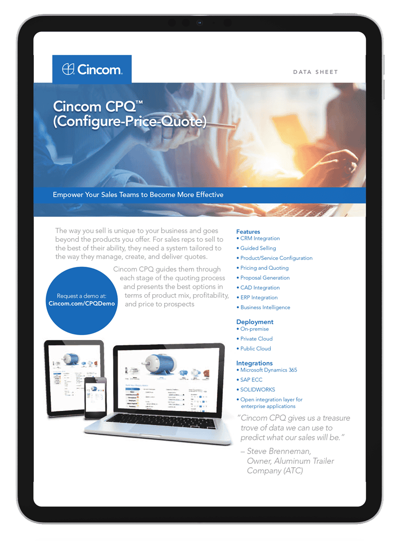 Download the datasheet to discover how Cincom CPQ™ simplifies the quoting process, automates complex configurations, and drives better sales outcomes.